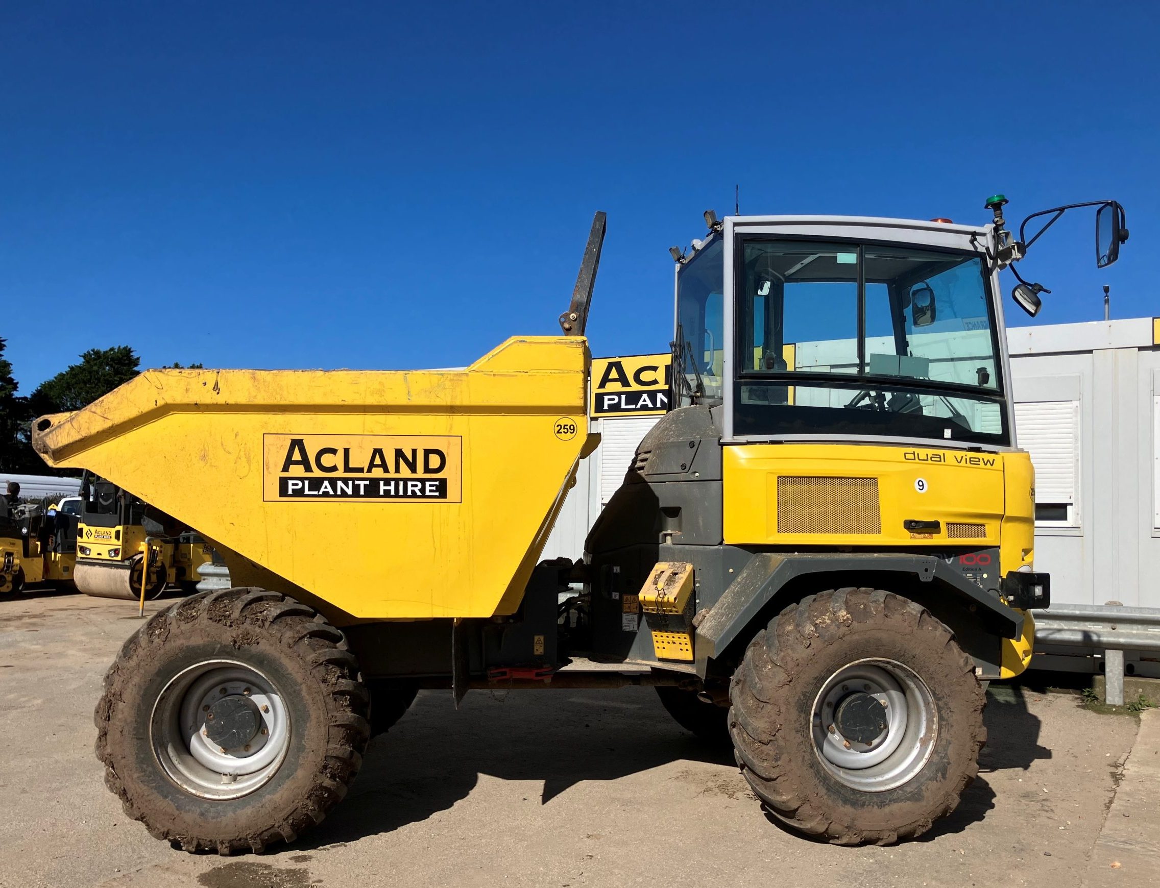 This swivel skip dumper weighs 5.34T empty and has a max carrying capacity of 9T. It is 2.5m wide, 2.3m high (with ROPS folded down) and 4.48m long. Our fleet also consists of some road registered machines.